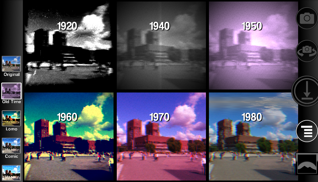 - Old Time: make your camera look like something from the 20′s, 40′s, 50′s, 60′s, 70′s or 80′s